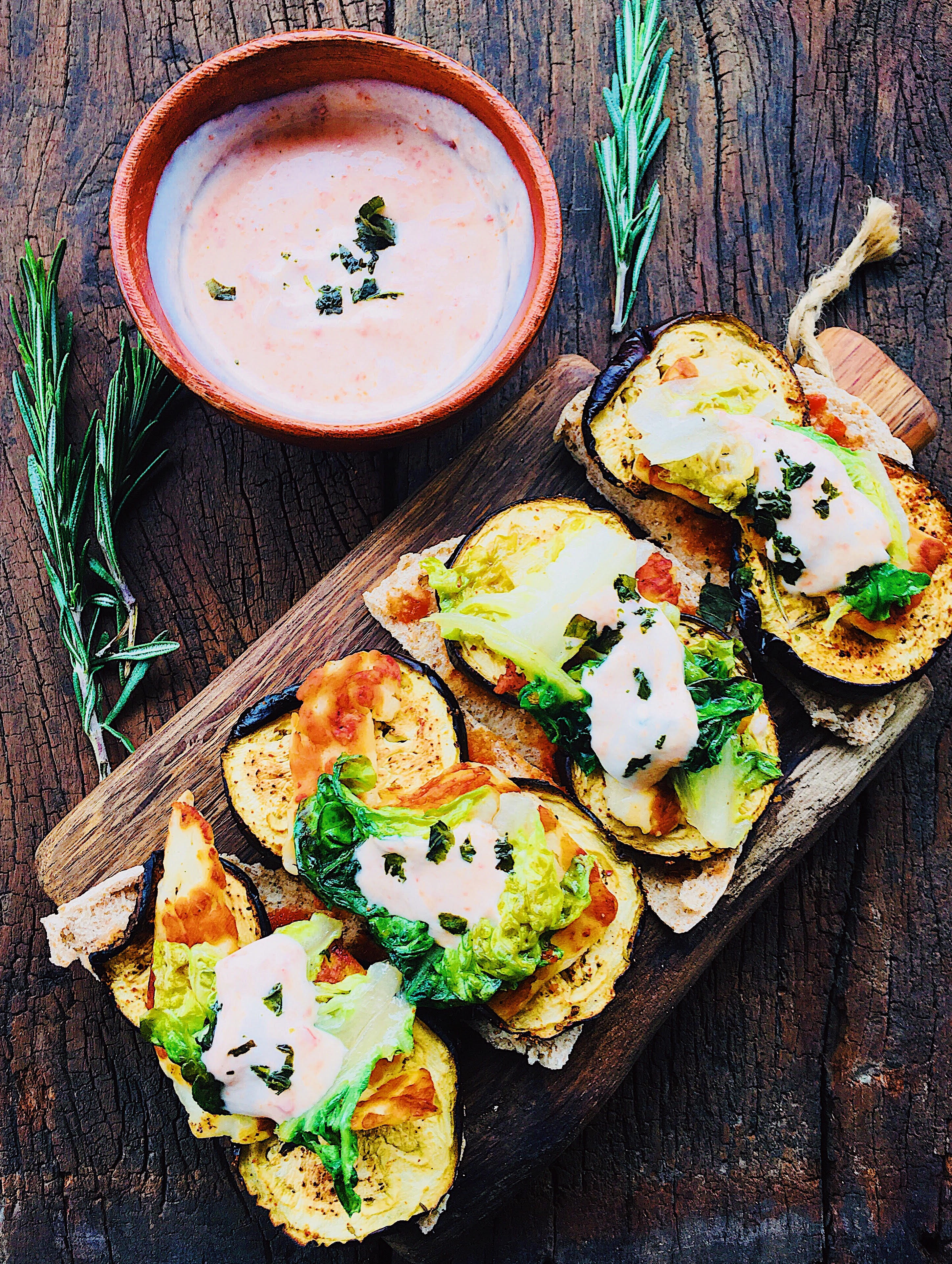 5.Time to assemble. Take a toasted pitta bread , slice it into 4 portions or less depending on how big you would like each toast to be. Add a small layer of sriracha sauce ( not the dip, but the sauce itself ), add a layer of lettuce, followed by halloumi cheese and then aubergine on the top. Add a dollop of yogurt dip on the top and add some more parsley if you like. Repeat this for all the toasts and its ready to serve :-). You can also add some salt on the top but since Halloumi is salty, I skipped it for this recipe.