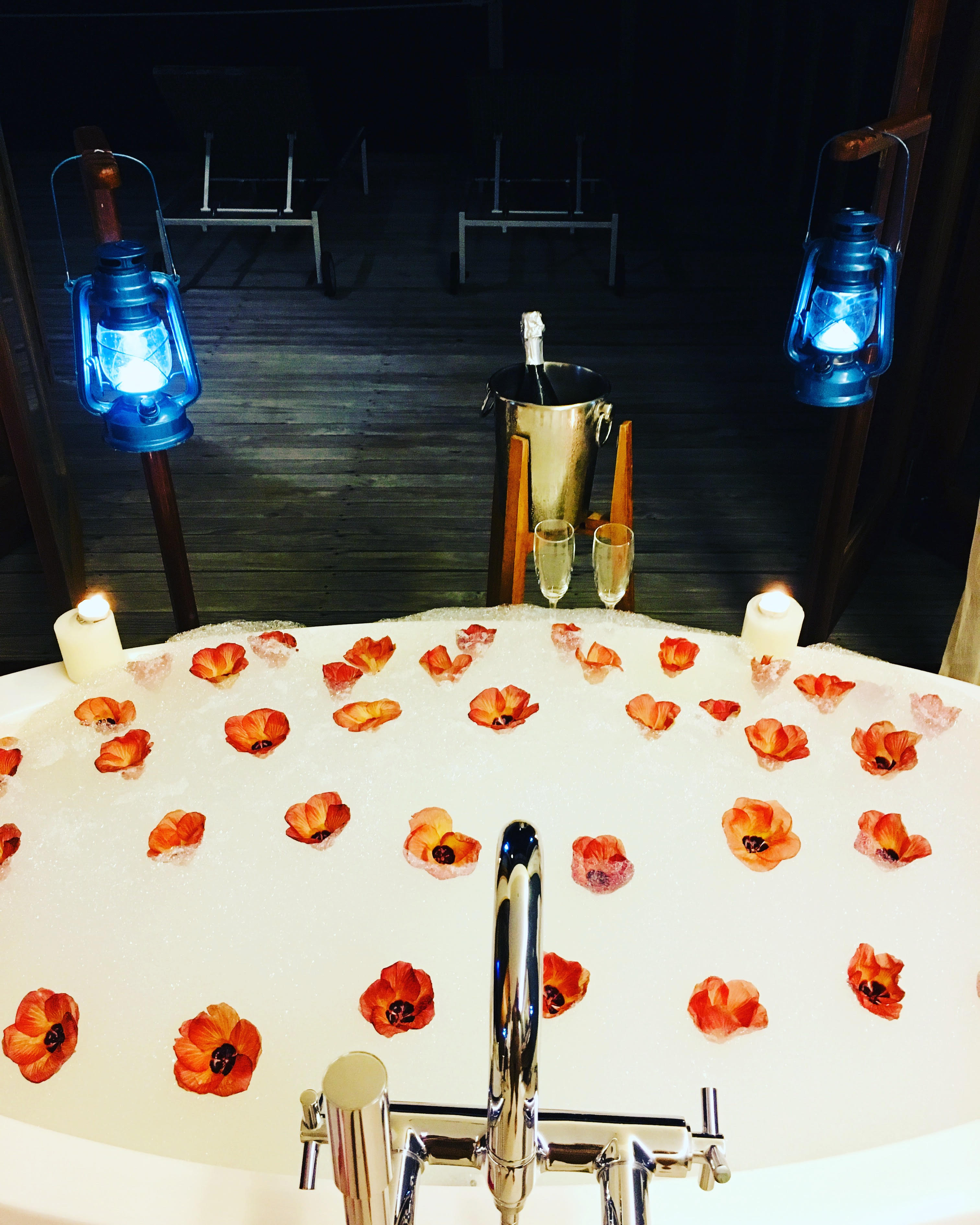 Things to do : The pictures above give you a glimpse of some of the amazing things you could do during your stay at the Maldives . 1.Special bath experience : Our resort arranged this in our room where they use hand-picked flowers from around the island and locally created essential oils to have an amazing bathing experience overlooking the ocean. The massage rooms are just spectacular, as they have glass floors and you cam admire the marine life while getting a massage done. Definitely recommend !
